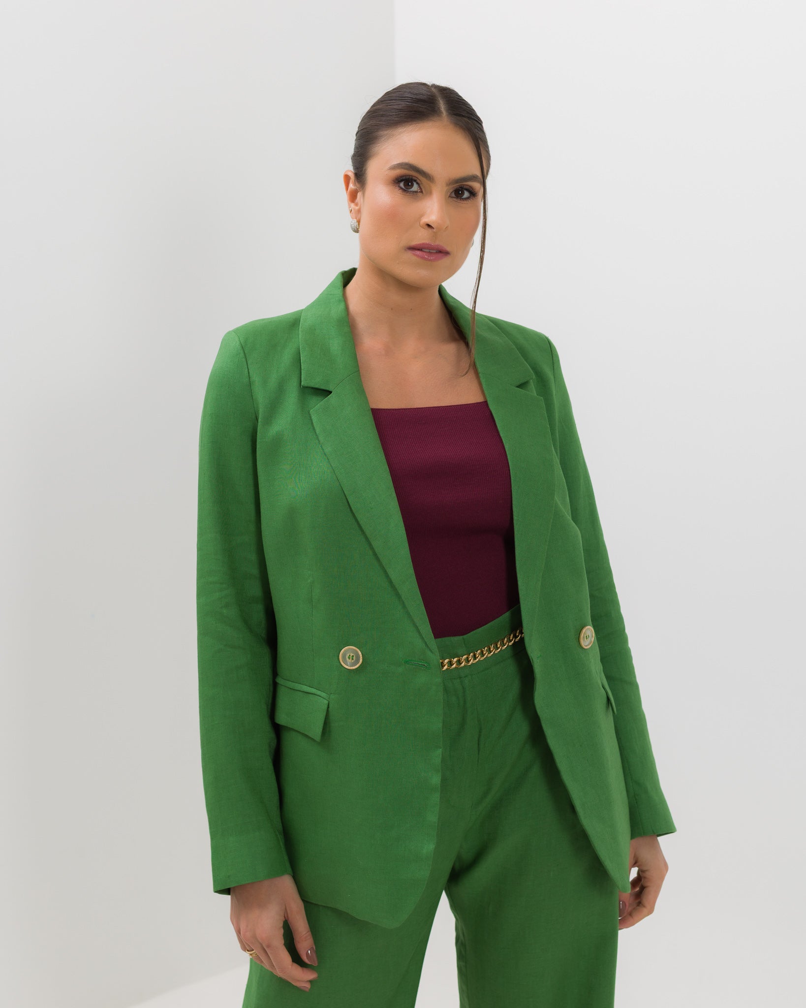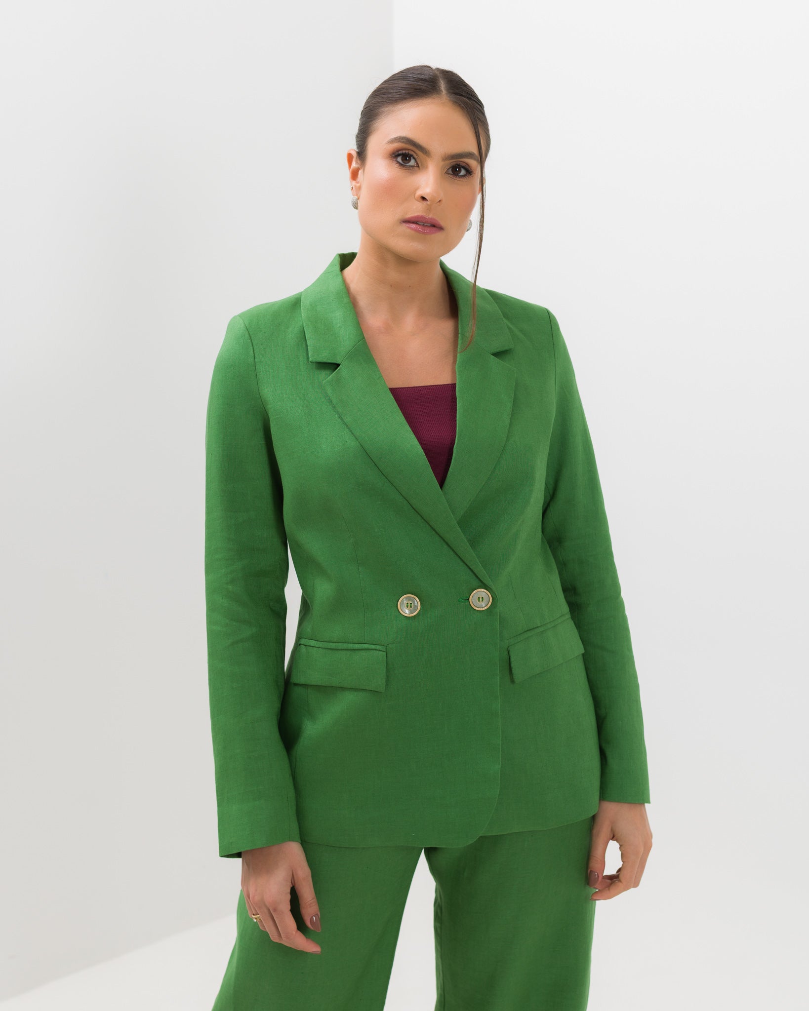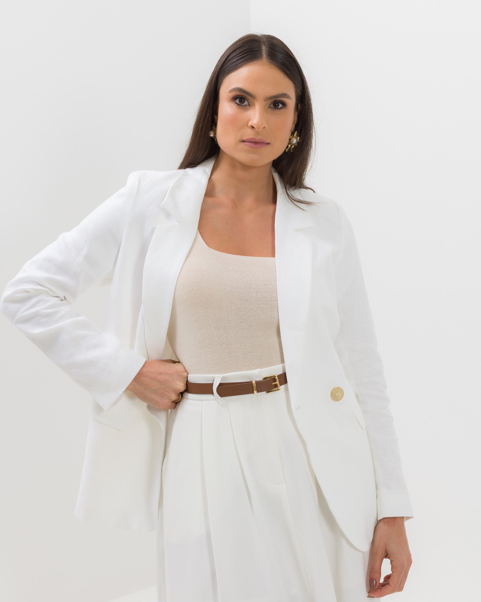 O Blazer transpassado 100% Linho - Helena é uma opção elegante e sofisticada para o seu guarda-roupa. Confeccionado em linho 100% natural, proporciona conforto e leveza. O corte transpassado traz um toque moderno e versátil, perfeito para looks de trabalho ou ocasiões especiais.